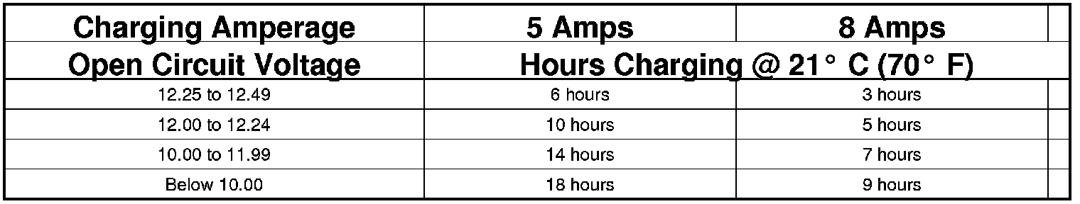 The Battery Charging Time Table gives an indication of the time required to charge a typical battery at room temperature based upon the battery state-of-charge and the charger capacity.