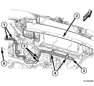 1. Install the power steering fluid cooler line (3) to the bumper reinforcement (2) by installing the two cooler mounting push pins (4).