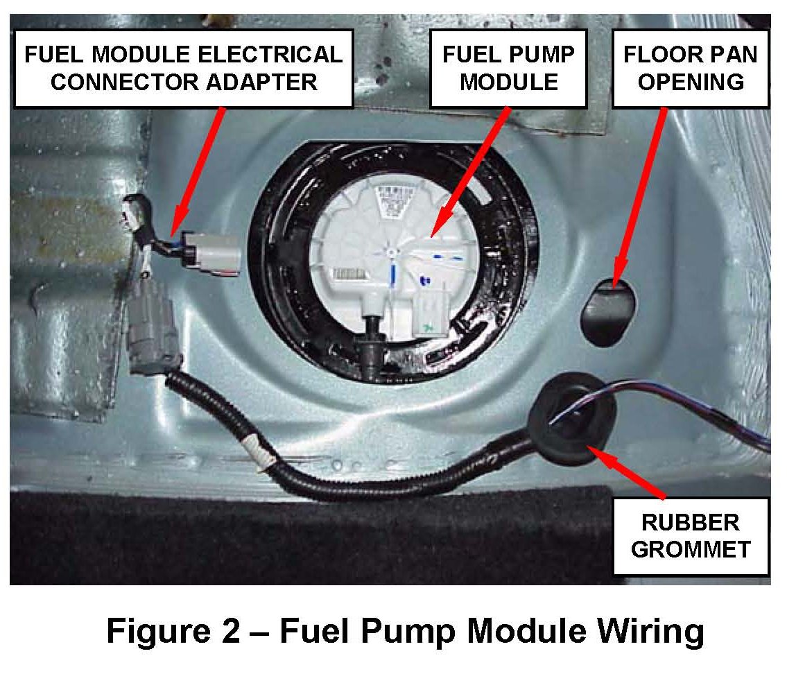 6. Remove the fuel pump module wiring harness rubber grommet from the floor pan opening and pull wiring from body opening (Figure 2).