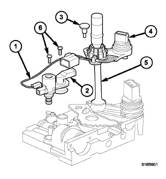 The Pressure Control Solenoid (1) is mounted on the top of the valve body, next to the Line Pressure Sensor (2).