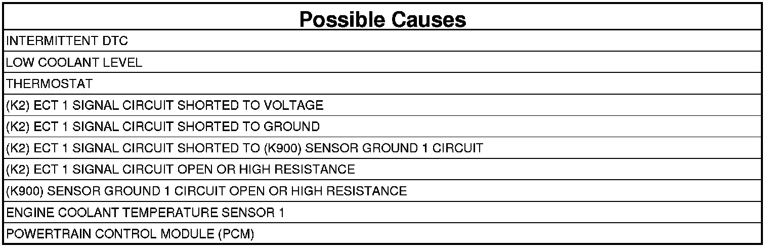 - Repair the (K2) ECT 1 Signal circuit for a short to the (K900) Sensor Ground 1 circuit.