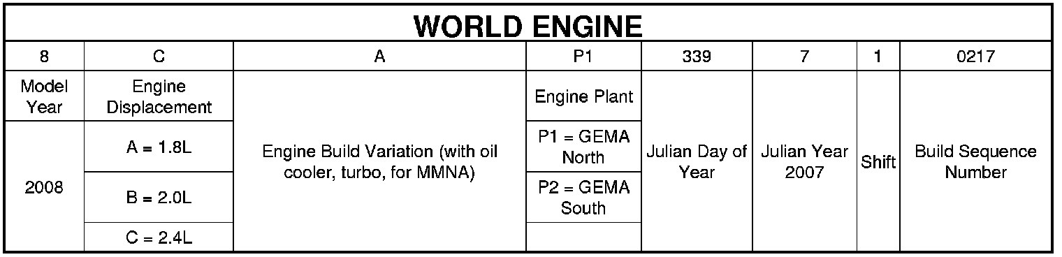 and the bellhousing. The serial number contains engine build date, build location, and displacement.