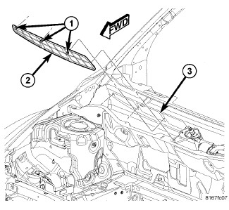 1. Position the HVAC housing air inlet screen (2) to the cowl panel (3) and fully engage the three push-in retainers (1) that secure the screen to the panel.