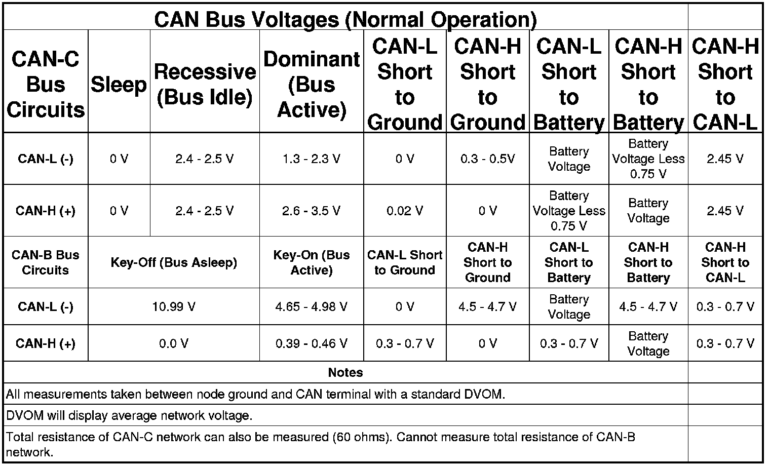 The termination resistance of two dominant nodes is combined in parallel to provide a total of about 60 ohms. This resistance value may vary somewhat by application, depending upon the number of non-dominant nodes on the CAN-C bus. On the CAN-D bus (or Diagnostic CAN-C) all of the 60 ohm termination resistance is present in the Central GateWay (TIPMCGW).