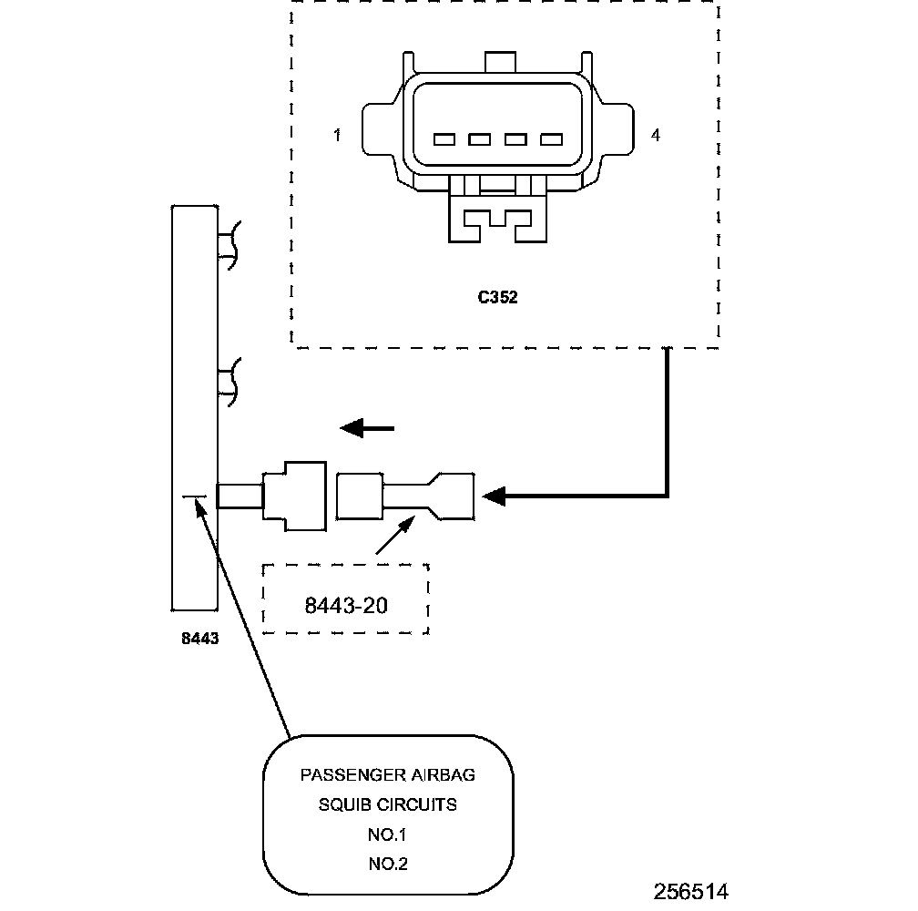 2. Connect the 8443 Load Tool and 8443-20 Jumper to the Right Seat Airbag C352 in-line connector (Body Side).