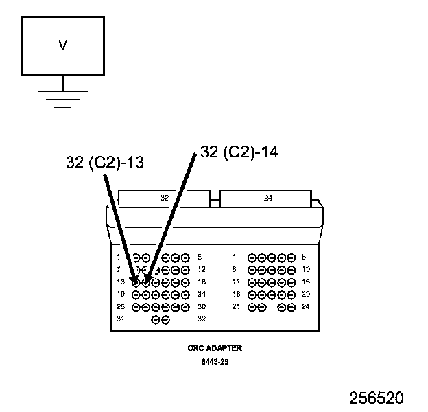 5. Measure the voltage of the (R8) Right Seat Squib 1 Line 1 circuit between the ORC 8443-25 Adaptor cavity C2-14 and ground.