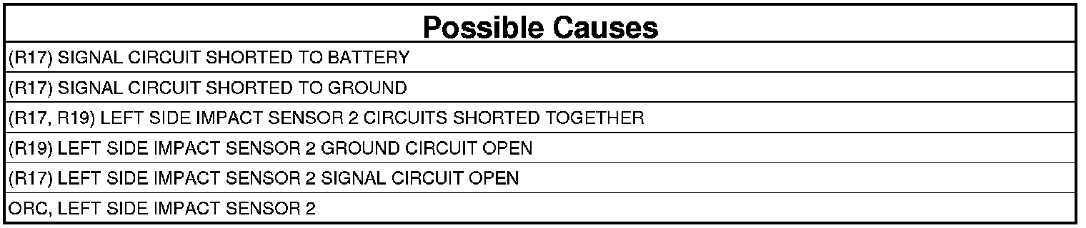 - Repair the (R17) Left Side Impact Sensor 2 Signal circuit for an open or high resistance.