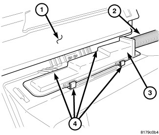 1. Position the beverage cooler outlet (3) to the top of the storage bin and engage the four retaining tabs (4) by sliding the outlet toward the center of the instrument panel top cover (1). Make sure the tabs are fully engaged.