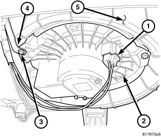2. Install the three screws (3) that secure the blower motor and the wire lead bracket (4) (if equipped) to the HVAC housing. Tighten the screws to 1.2 Nm (10 in. lbs.).