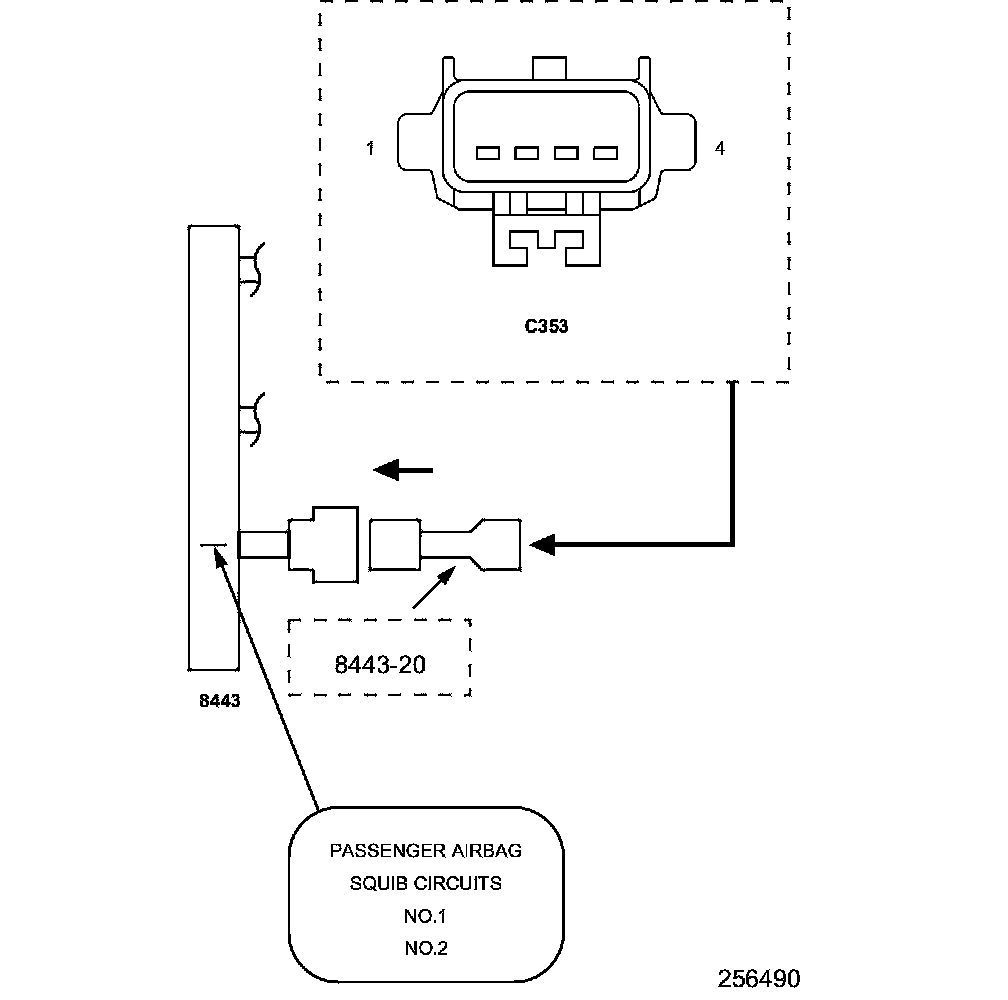 - Repair or replace the Left Seat Airbag wiring harness (Side Airbag Jumper). Open Left Seat Airbag circuits between the C353 in-line connector and the Left Seat Airbag connector.