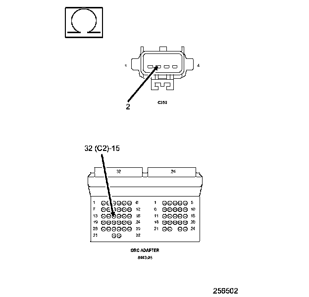 1. Measure the resistance of the (R7) Left Seat Squib 1 Line 1 circuit between the ORC 8443-25 Adaptor cavity C2-15 and the C353 in-line connector (body side) cavity 2.