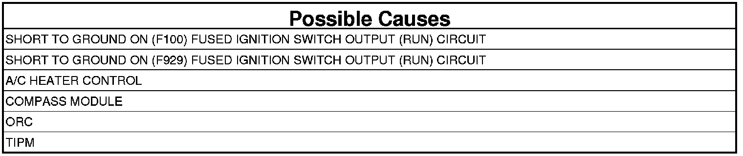 The TIPM detects a short to ground condition on the Fused Ignition Switch Output (RUN).