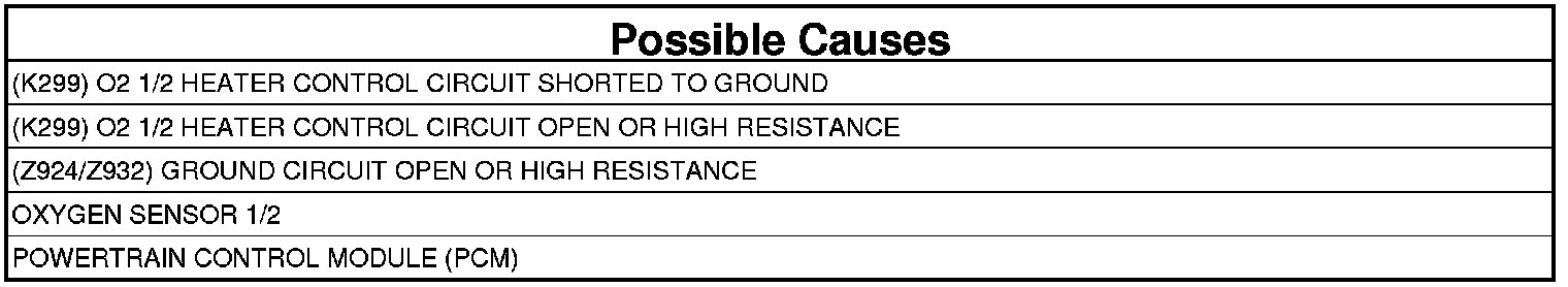 - Repair the (K299) O2 1/2 Heater Control circuit for a short to ground.