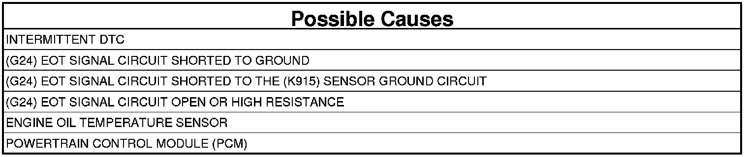 1. Measure the resistance of the (G24) EOT Signal circuit between the Engine Oil Temperature Sensor harness connector and the Powertrain Control Module (PCM) harness connector.