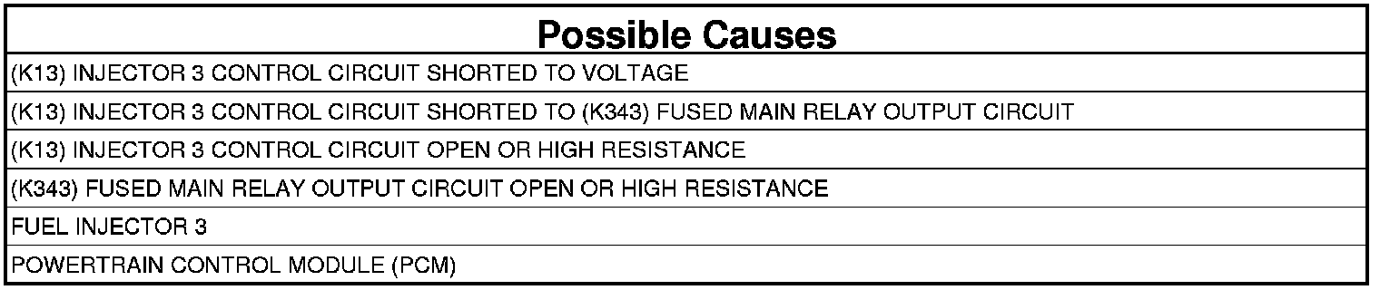 - Repair the (K13) Injector 3 Control circuit for a short to the (K343) Fused Main Relay Output circuit.