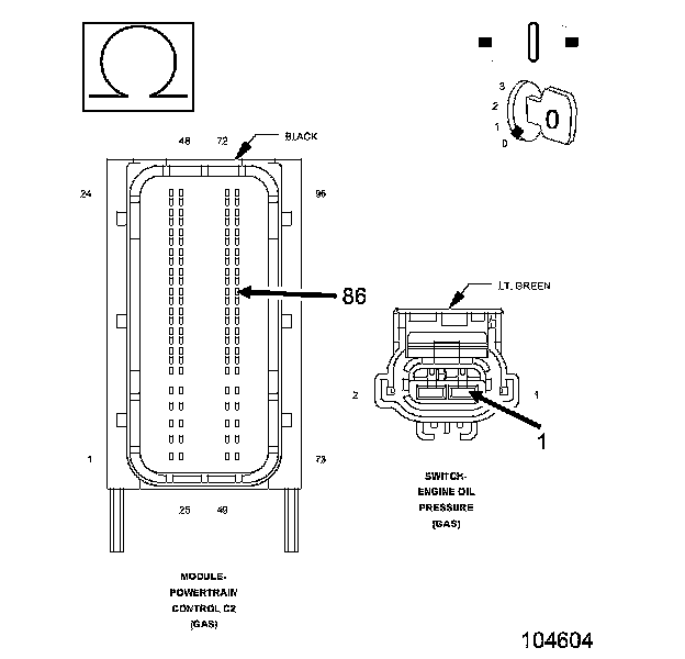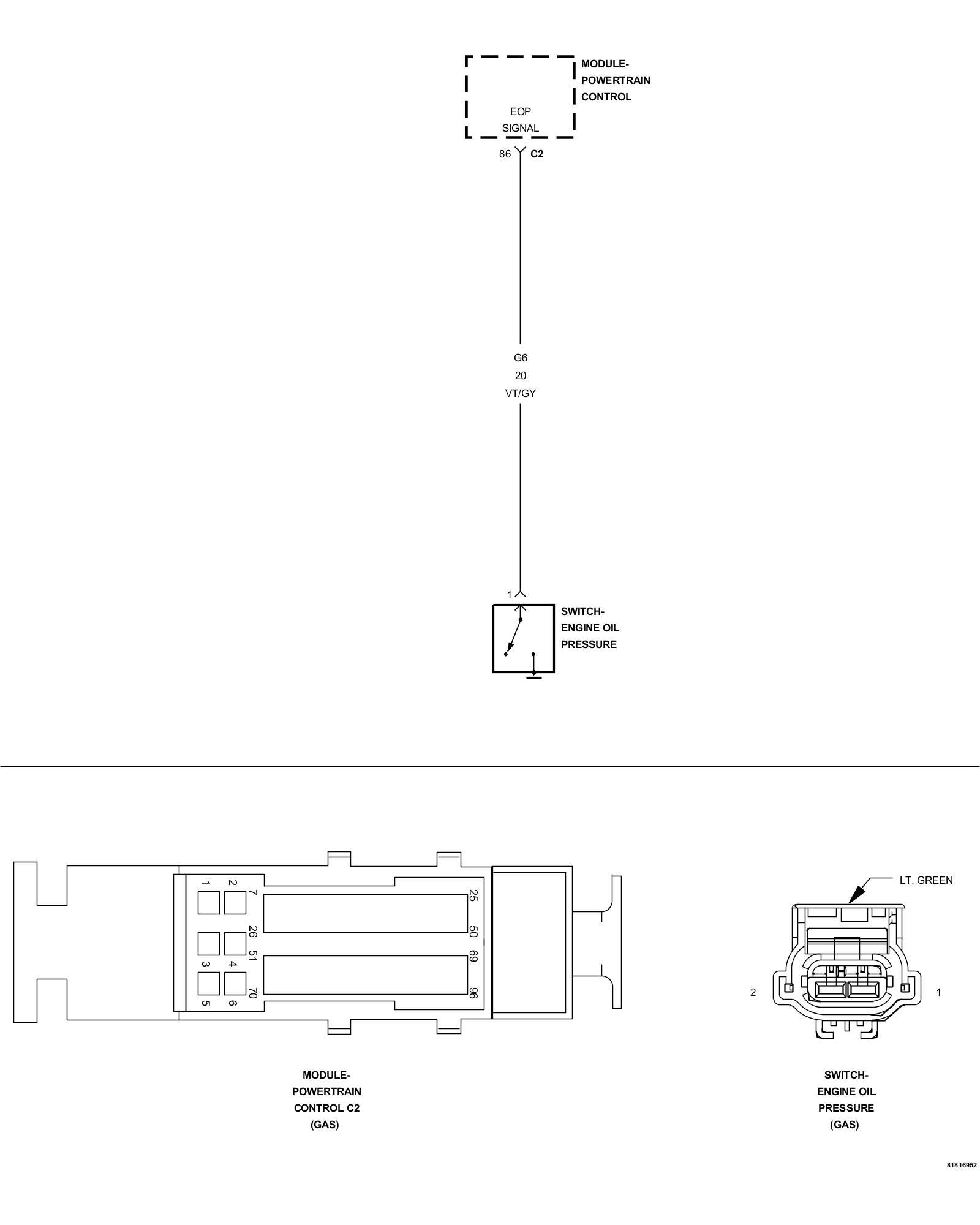1. Using the wiring diagram/schematic as a guide, inspect the wiring and connectors between the Engine Oil Pressure Switch and the Powertrain Control Module (PCM).