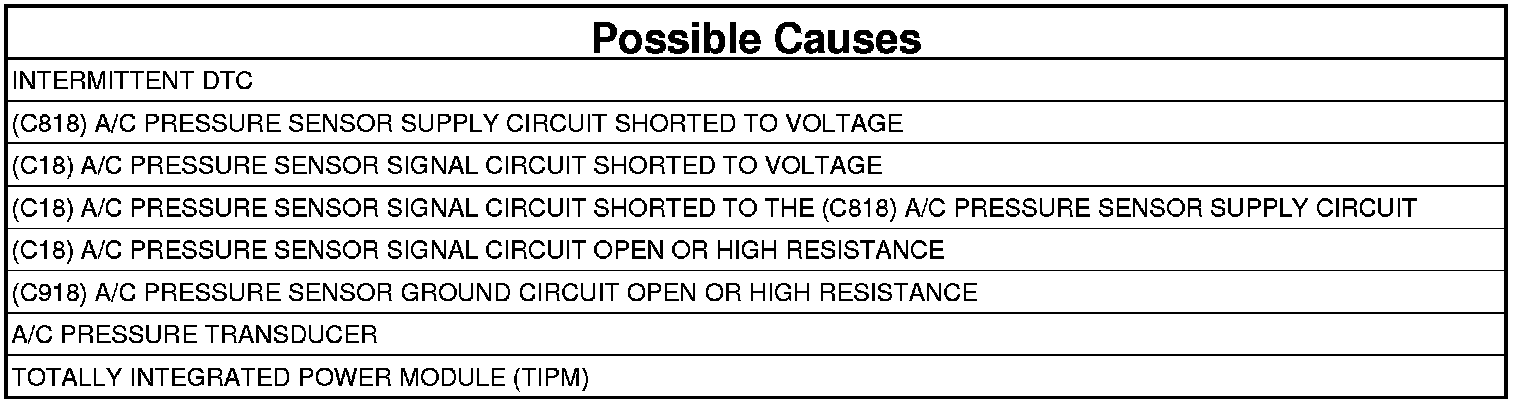 - Repair the (C18) A/C Pressure Sensor Signal circuit for a short to the (C818) A/C Pressure Sensor Supply circuit.