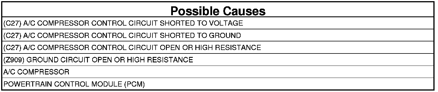 - Repair the (C27) A/C Compressor Control circuit for a short to voltage.