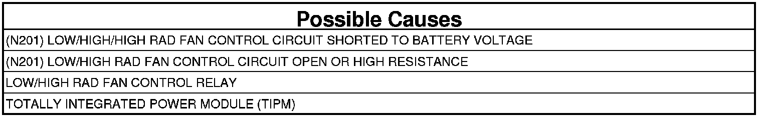 - Repair the short to ground in the (N201) Low/High Rad Fan Control circuit.