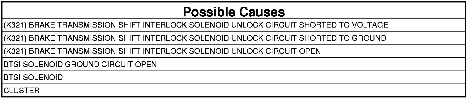 - Repair the (K321) Brake Transmission Shift Interlock Solenoid Unlock circuit for an open.