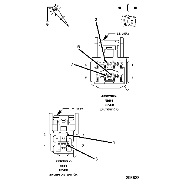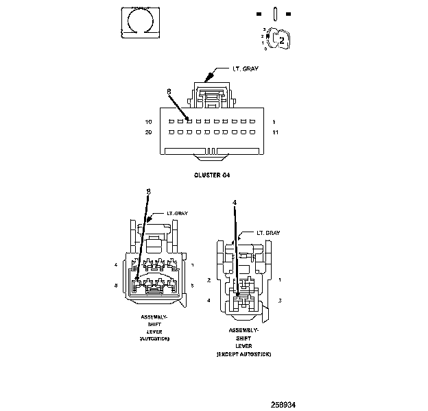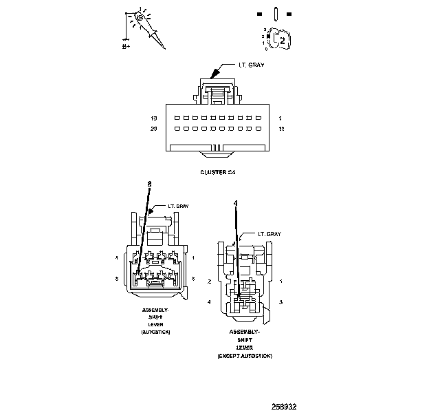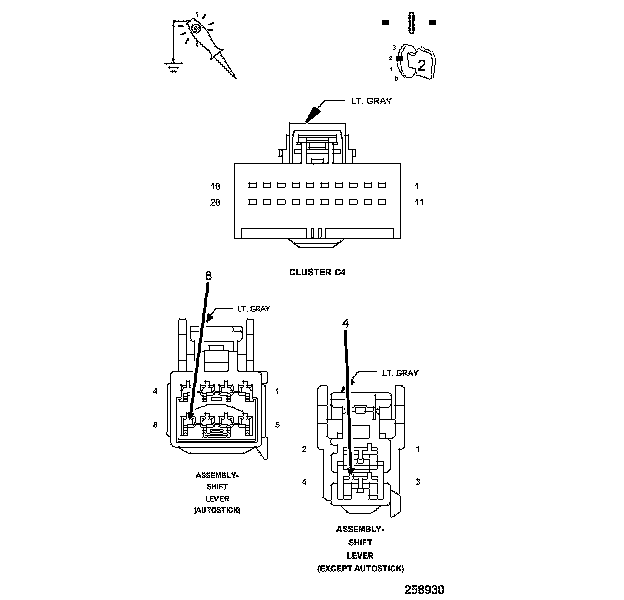 2. Using a test light connected to B+. Measure the resistance between ground and the Ground circuits in the Shift Lever Assembly harness connector.