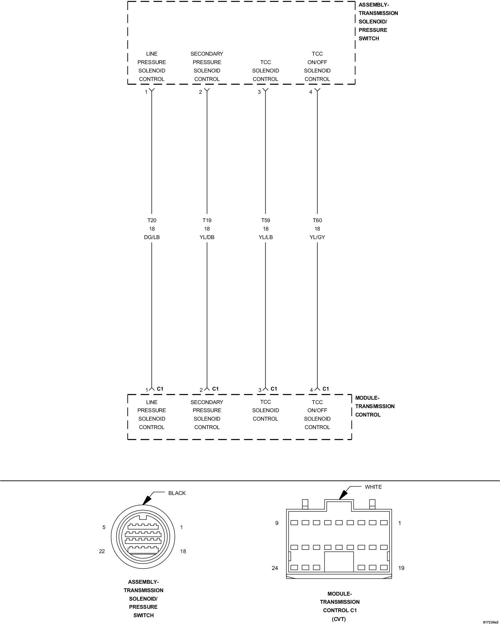 5. Using a test light connected to ground, check the (T19) Secondary Pressure Solenoid Control circuit in the Transmission Solenoid/Pressure Switch Assembly harness connector.