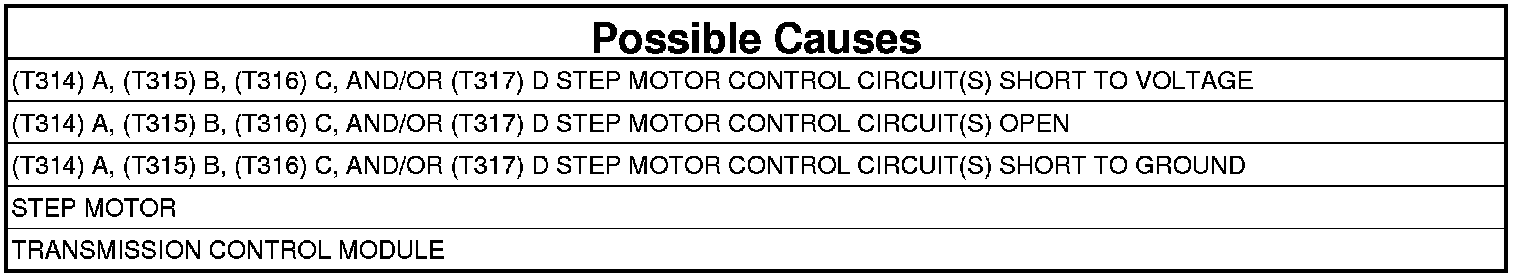 - Repair the (T314) A, (T315) B, (T316) C, and/or (T317) D Step Motor Control circuit(s) for a short to ground.