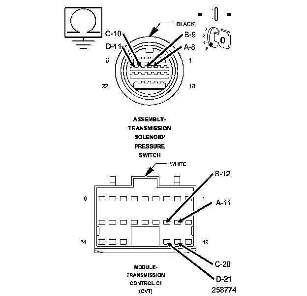 2. Measure separately the resistance of the (T314) A, (T315) B, (T316) C, and (T317) D Step Motor Control circuits between the TCM C1 harness connector and the Transmission Solenoid/Pressure Switch harness connector.
