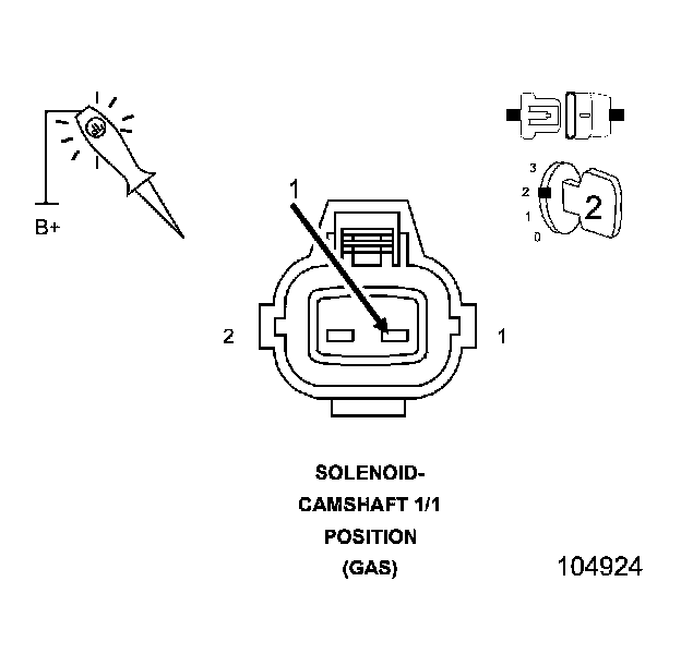 4. Using a 12 volt test light connected to ground, check the (K343) Fused Main Relay Output circuit in the Camshaft 1/1 Position Solenoid harness connector.