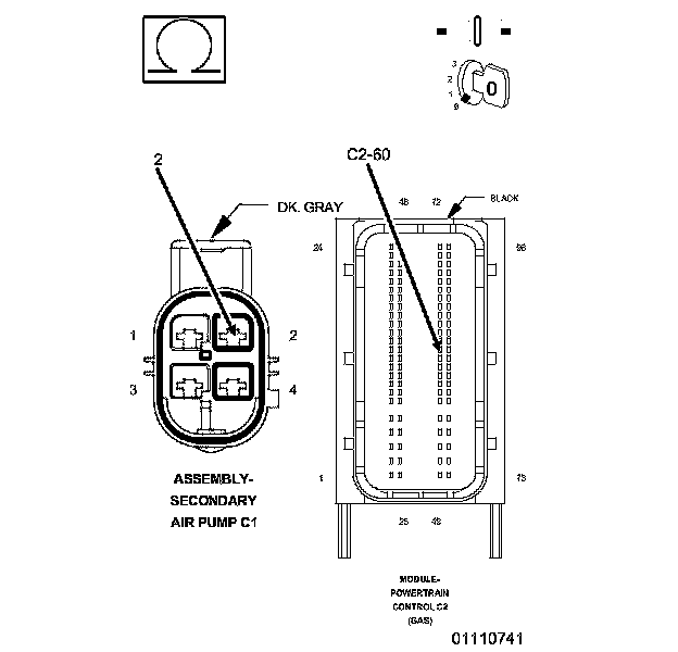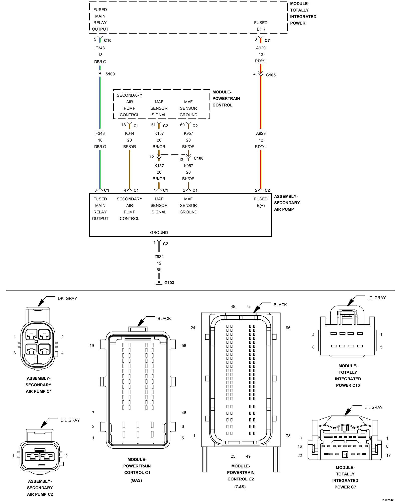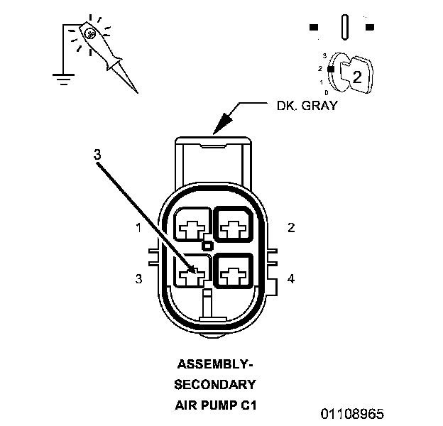 2. Using a 12-volt test light connected to 12 volts, check the (K957) MAF Sensor Ground circuit in the C1 Secondary Air Pump Assembly harness connector.