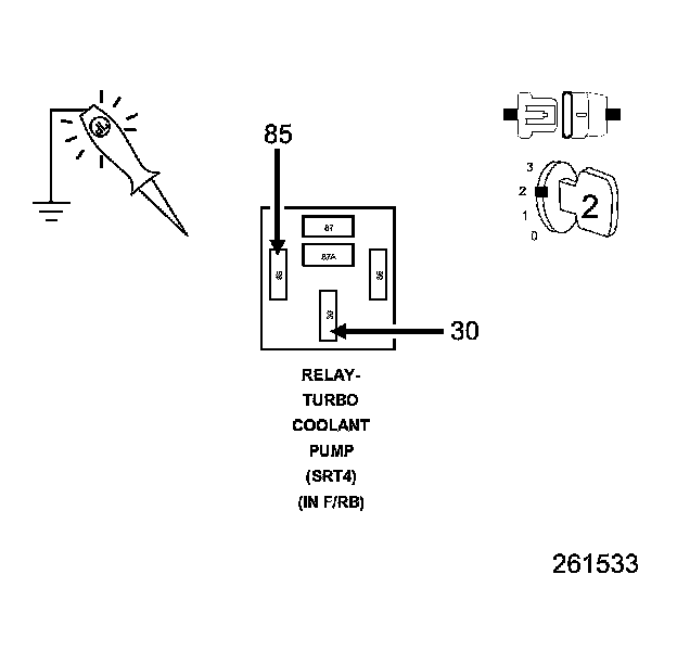 4. Using a 12 volt test light connected to 12 volts, check the (K547) Turbo Coolant Pump Control circuit in the Turbo Coolant Pump Relay harness connector.
