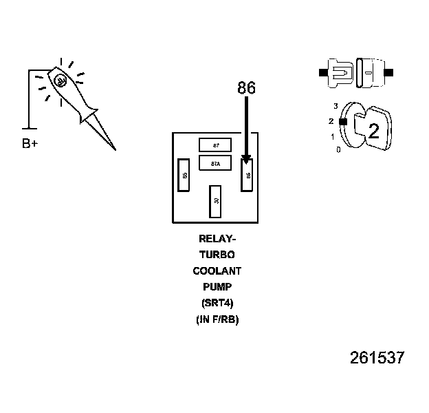 4. Using a 12 volt test light connected to ground, check the (A937) Fused B(+) circuits in the Turbo Coolant Pump Relay harness connector.