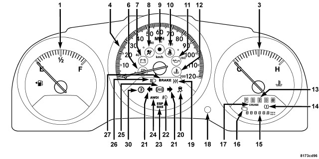 The Electronic Vehicle Information Center (EVIC) features a driver-interactive display (29). The display is located in the lower left part of the instrument cluster below the fuel and engine temperature gauges (1 and 3). This system conveniently allows the driver to select a variety of useful information by pressing the STEP button (28) to the right of the EVIC display. The EVIC displays information related to the following: