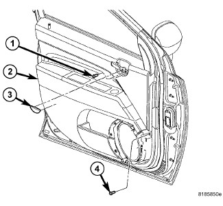 13. Pull the front of the trim module (1) out from the door and forward to remove the latch.