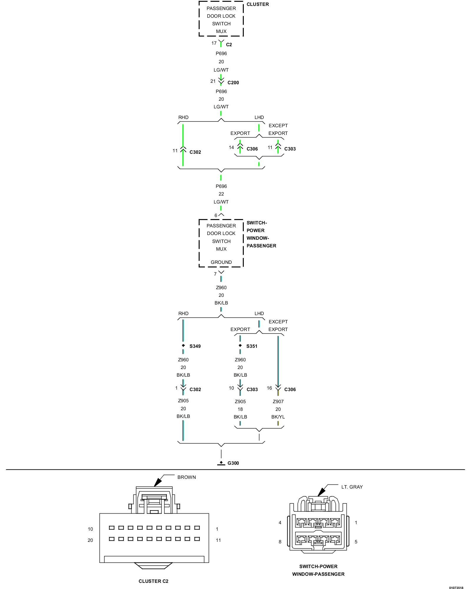 1. Measure the resistance of the (P696) Passenger Door Lock Switch Mux circuit between the Cluster C2 connector and the Passenger Window/Door Lock Switch connector.