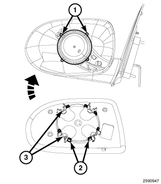 2. Position the mirror glass onto the mirror housing and line up the slots (3) in the glass assembly with the tabs (1) on the mirror actuator.