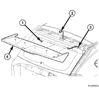 4. Remove the adhesive cover strips, install spoiler (4) to the lift gate and press down on the areas of the spoiler that have the adhesive patches installed.