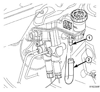 7. If equipped with a manual transaxle, slide the clutch actuator hose (2) onto the reservoir port (1). Install the hose clamp just past the upset bead on the port.