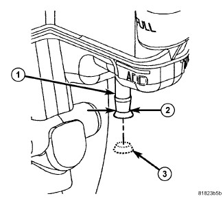 6. If equipped with a manual transaxle and a new reservoir is being installed, using an appropriate cutting tool, cut the clutch actuator port at the center of the "V" groove (2) opening the hydraulic clutch port (1). Discard the severed plug (3).