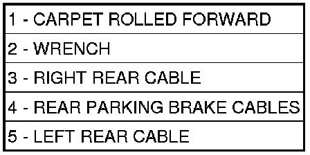 8. Fold the rear carpeting forward (1) to expose the parking brake cables (4) at the end of the rear floor.