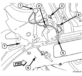 5. Remove the speed sensor cable routing clip (2) from the outside frame rail (6).