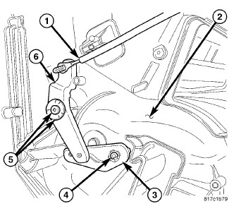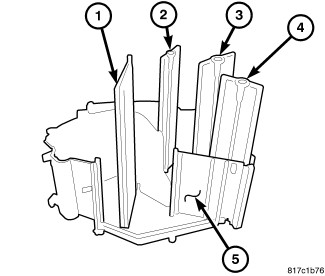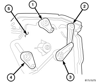 1. Install the four mode door levers (1, 2, 3 and 4) onto the right side of the air distribution housing (5) Make sure the lever retaining tabs are fully engaged to the housing.