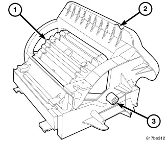 1. Carefully install the recirculation-air door (1) into the air inlet housing (2) by pinching the two ends of the air-door together and aligning the pivot shafts of the air-door to the pivot shaft holes in the air inlet housing.