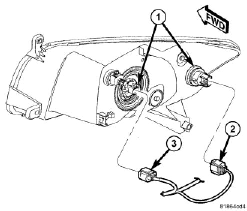 2. Connect the two front lamp unit electrical connectors (2 and 3).