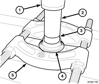 11. If the bearing race is still pressed onto the hub, install the Bearing Splitter (5), Special Tool 1130, between the hub flange and the bearing inner race (4).