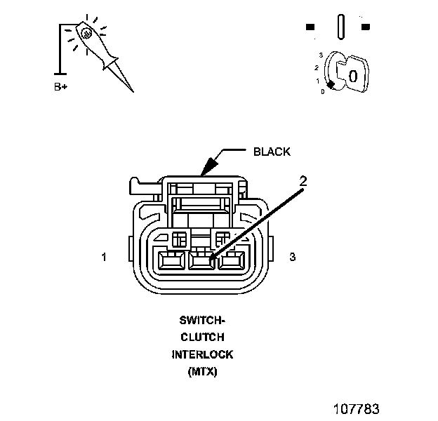 2. Using a 12-volt test light connected to battery voltage, probe the Clutch Interlock Switch ground circuit.