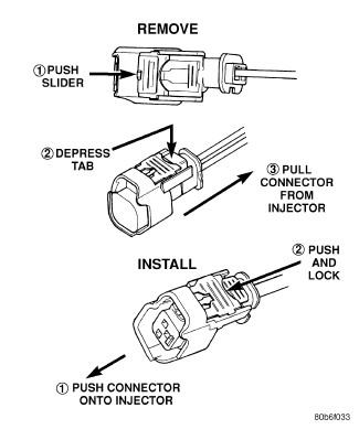 2. To remove connector pull the red colored slider away from injector (1). While pulling the slider, depress tab (2) and remove connector (3) from injector. The factory fuel injection wiring harness is numerically tagged (INJ 1, INJ 2, etc.) for injector position identification. If harness is not tagged, make note of wiring location before removal.