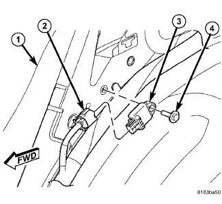 3. Install and tighten the screw (4) that secures the sensor to the inner C-pillar. Tighten the screw to 8 Nm (70 in. lbs.).
