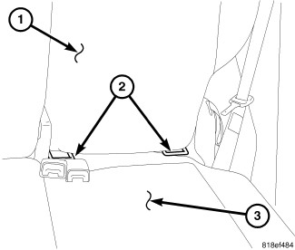 The upper tether anchors (1) are each integral to the second row seat back panels. These anchors are each constructed from short lengths of heavy-gauge steel wire that is securely welded into stamped steel cups that are integral to the seat back panels. There is a separate molded plastic trim bezel (2) located around each of these anchors. The child restraint upper tether anchors cannot be adjusted or repaired and, if ineffective or damaged, they must be replaced as a unit with their respective second row seat back panels.
