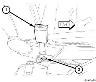 1. Position the front seat belt buckle (1) lower anchor onto the inboard side of the seat cushion frame.
